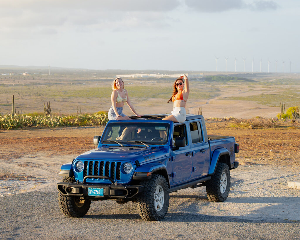 Explore Aruba your way with Aventurova Jeep Rental. Our Jeep Wrangler and Jeep Gladiator rentals come with 4X4 off-road tires and are built for island adventure — perfect for Arikok National Park, the Natural Pool, and Aruba’s rugged north coast.